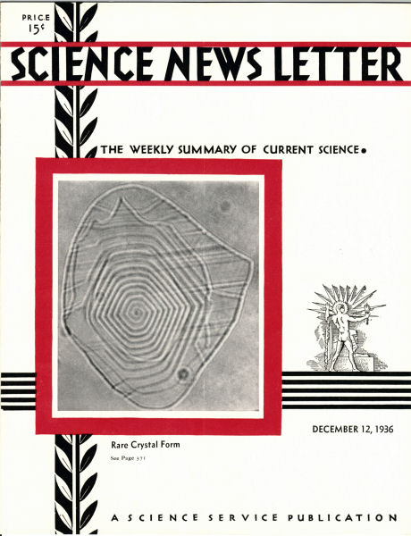 Spirals in abundance and of rare beauty have recently been discovered by Prof. C.M. Heck of North Carolina State College, and that, too, in common paraffin. Shown on the cover of this week’s Science News Letter is one of these spiral crystals as it grew from a solution of paraffin in mineral oil. It is magnified 1,200 diameters and shows each convolution repeating with exactness the exterior outlines of the crystal, a significant element of the discovery.