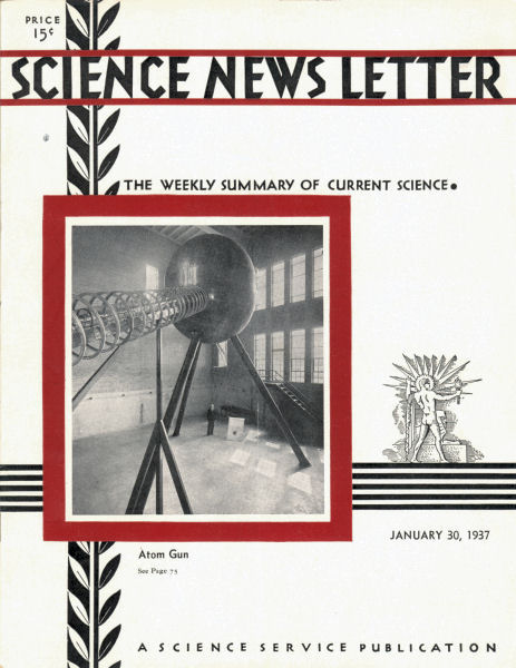 An electrostatic type of high-voltage generator with which scientists hope to create the tiny elemental particles known as positrons has now been installed at the physics laboratories of the University of Notre Dame. Under the direction of Prof. G.B. Collins, two graduate students, R.J. Schager and A.L. Vitter, have built the giant apparatus shown on the front cover of this week’s Science News Letter.