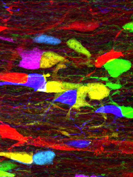 NERVE PROTECTORS The glowing cells in this micrograph of a mouse’s optic nerve help shield electrical signals passing between eyes and brain. The Brainbow technique allows scientists to visualize how the cells work together.