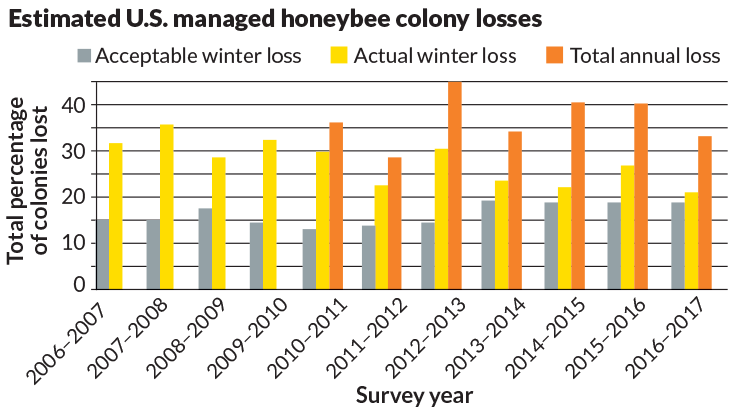 Colony losses each year are still running higher than beekeepers say would be acceptable (gray bar). Even though hives can be split so numbers eventually build up again, the slowdown and expense raise the costs of pollination.