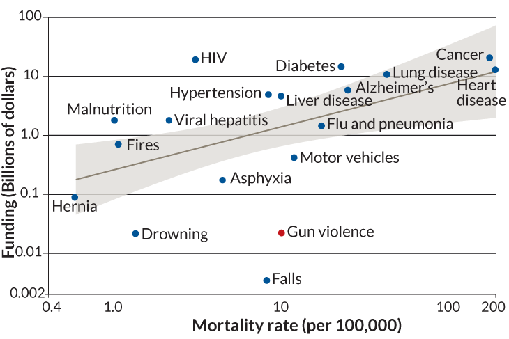 Compared with other leading causes of death, research into gun violence is among the least funded, an analysis of U.S. mortality data and federal funding from 2004 to 2015 reveals. Funding for research on gun violence is 1.6 percent of what would be expected, given the number of gun deaths.
