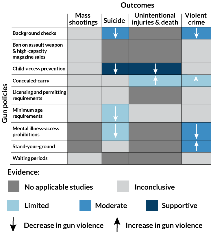 Some gun policies, such as background checks, do curtail gun violence (down arrows), while others, like concealed carry laws, lead to an uptick (up arrows). But for most policies, the data are inconclusive or lacking entirely (light and dark gray).