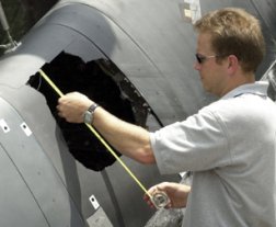 On Monday, NASA brought a dramatic conclusion to tests aimed at determining why the space shuttle Columbia disintegrated on Feb.1, killing all seven crew members. A block of foam insulation fired from a gun at more than 800 kilometers per hour smashed this unexpectedly large hole in a shuttle wing panel. After the test, officials said that the damage was a “smoking gun” that appeared to confirm investigators’ leading theory of what caused Columbia’s breakup (SN: 5/17/03, p. 308: Available to subscribers at Columbia Disaster Working Hypothesis: Wing hit by debris). In recent months, the investigation has increasingly focused on an errant piece of foam insulation from the shuttle’s external fuel tank. The new test provides vivid evidence that foam seen crashing into a heat-resistant panel on the spacecraft’s left wing during liftoff could have punched a hole big enough to allow superheated air to enter and destroy the wing during the craft’s reentry. Measuring the hole is NASA contractor Dan Bell.