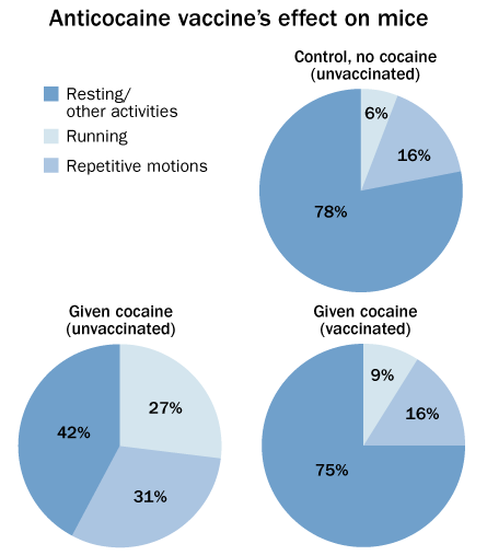 Antibodies elicited by the vaccine kept about two-fifths of the cocaine from reaching the brain in vaccinated animals, according to examinations of the mice, which were given the maximum dose of cocaine. This effect translated into behavioral changes: Cocaine makes mice hyperactive, Crystal says, and in this study the unvaccinated mice were running around much of the time. In contrast, vaccinated mice ran one-third as much and performed repetitive motions half as much, behavior similar to that of mice not given cocaine at all.