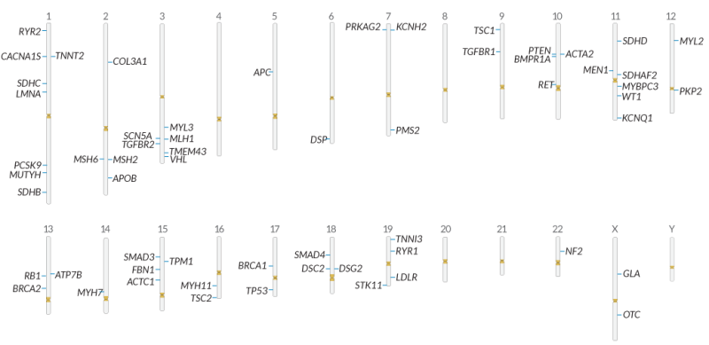 The American College of Medical Genetics and Genomics suggests that laboratories tell customers who get tested about harmful variants in 59 genes (see BRCA1 on chromosome 17 and BRCA2 on chromosome 13, below). With a heads-up that they have such variants, people can take action by, for example, getting more frequent screening.