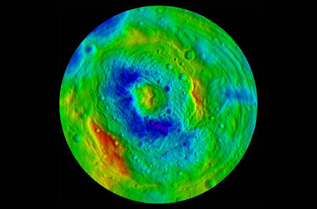 Dawn recently completed a survey orbit that peered down upon Vesta’s rough surface from 2,700 kilometers up. The data show that Vesta’s surface composition is highly varied. The heavily cratered northern surface appears to be older than the smoother southern surface by several billion years, says Nico Schmedemann of the Free University of Berlin, Germany, who presented evidence suggesting that the asteroid’s northern surface is just shy of 4 billion years old, but that the south pole basin could be a spry 2.5 billion years old.