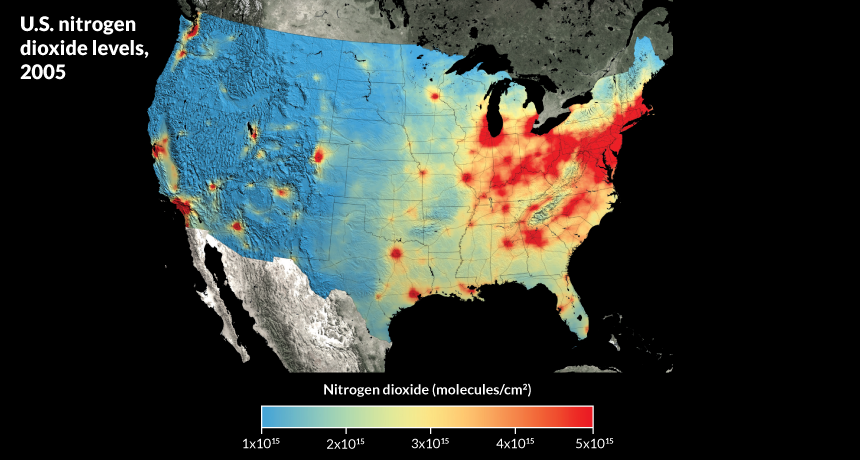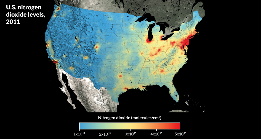 NO2 may not have the notoriety of carbon monoxide or lead, but it causes respiratory problems and combines with other pollutants to form ground-level ozone, a major part of smog. “You wouldn’t get unhealthy levels of ozone in cities without nitrogen dioxide,” says Bryan Duncan, an atmospheric scientist at NASA’s Goddard Space Flight Center in Greenbelt, Md.