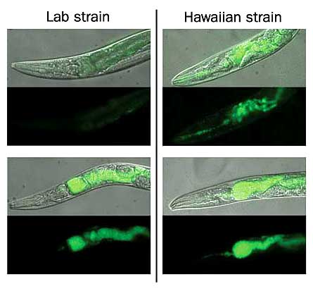 Well-fed lab strains can afford to be choosy about what they eat, says Kim. On the other hand, the Hawaiian strain may do better to risk infection, but get a good meal. The new research shows how a naturally occurring mutation in a single gene can cause clear behavioral differences, which ultimately lead to different survival rates.