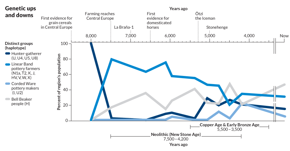 But then, in a demographic and genetic triumph, early farmers distinguished by a type of pottery decorated with lines and known as the Linearbandkeramik, or Linear Band ceramics, began to take over. Those farmers walked out of the Middle East, through what is now Turkey, and into Europe carrying a veritable alphabet soup of mitochondrial haplotypes, including N1a, HV, J, K, T2, V, W and X, Haak and colleagues reported. The hunter-gatherer lines dwindled and by 7,500 years ago, fewer than 3 percent of skeletons in central Germany bore the U haplotype.