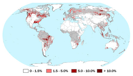 On a percentage basis, forests are vanishing most quickly in the boreal region encircling the Arctic. More than 350,000 square kilometers — about 4 percent of the forests in that ecosystem — fell victim. Fires caused about 60 percent of those losses, says Hansen. Logging accounted for a substantial fraction of the remaining deforestation, which also included losses due to storms and beetle infestations (SN: 5/10/08, p. 9).