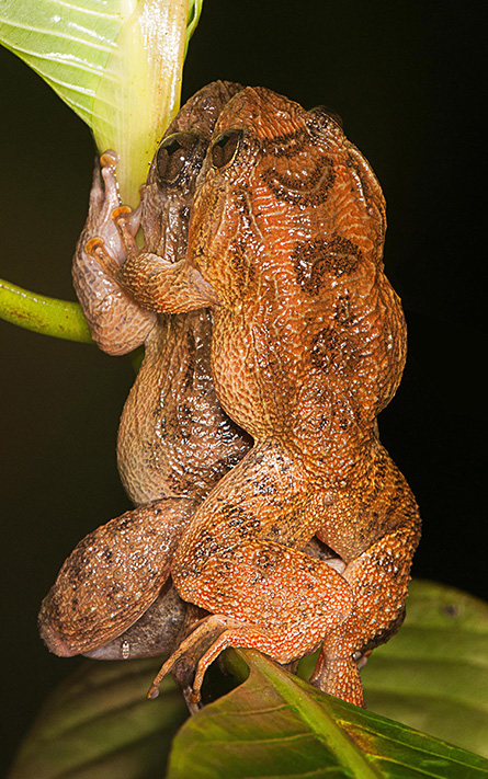 HEY, SUGAR A male Bombay night frog, puffed up with a croak after mating, hovers near eggs, although he fertilized them by an indirect no-touch approach.