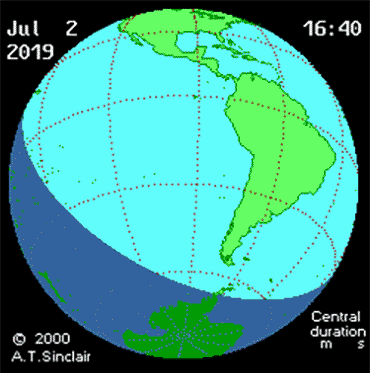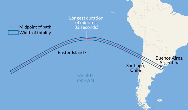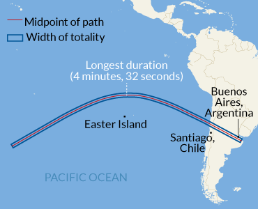 This year, the path of totality covers a chunk of the southern Pacific Ocean and a narrower swath of land, roughly 2,000 kilometers from western Chile to eastern Argentina. A partial eclipse will visible across other parts of the two countries as well as Paraguay, Uruguay, Bolivia, Peru, Ecuador and parts of Brazil, Colombia, Panama, Costa Rica and Nicaragua.