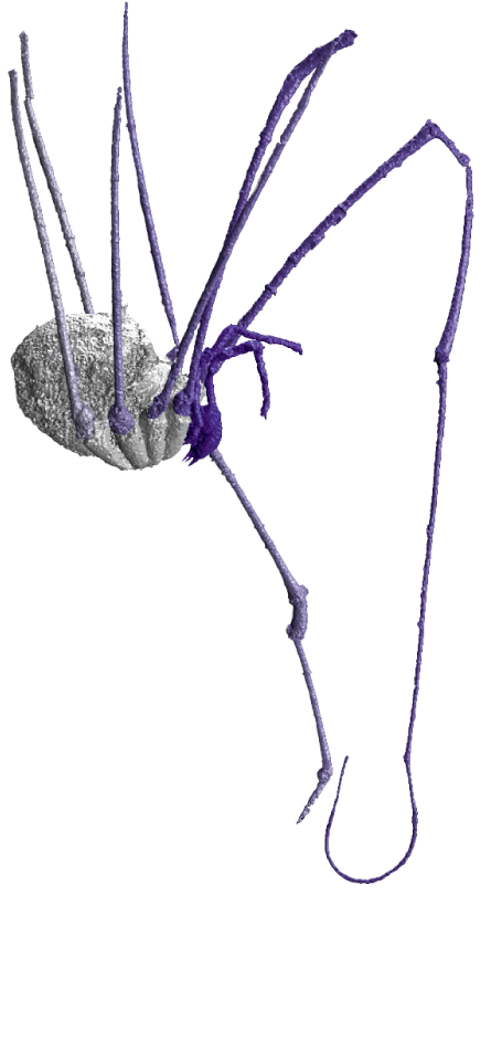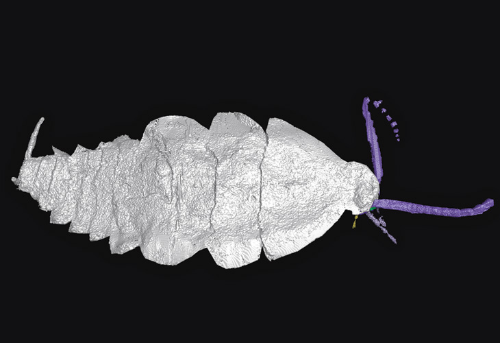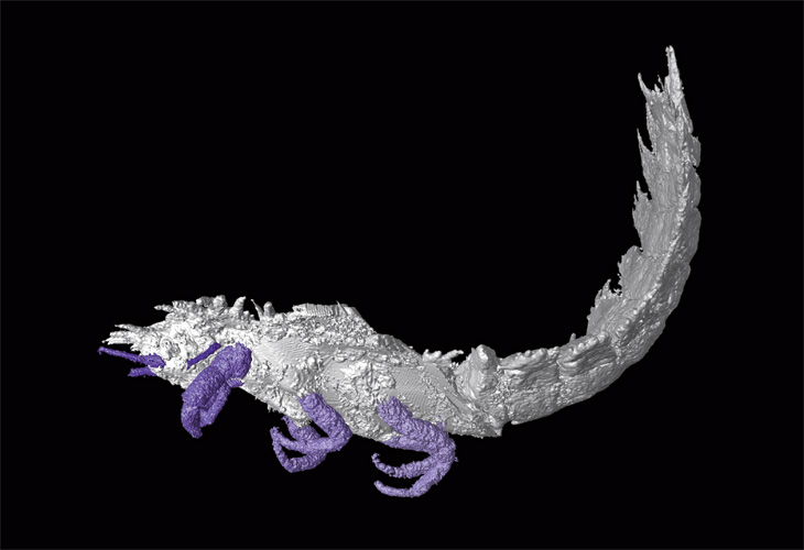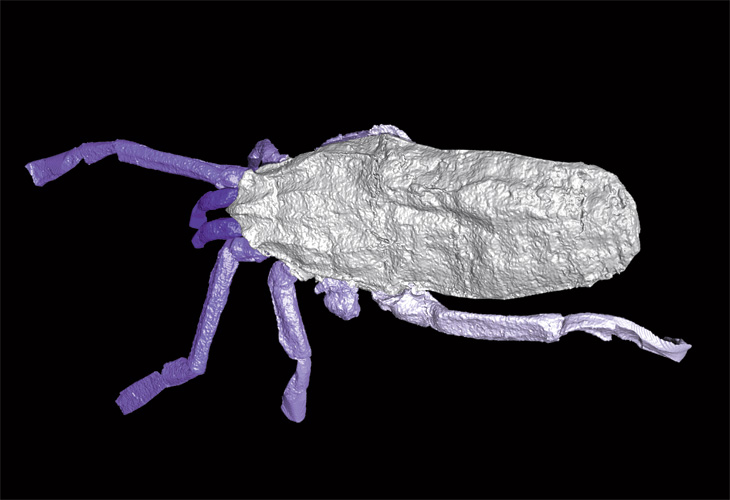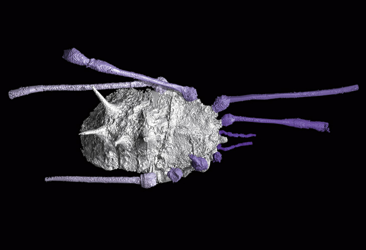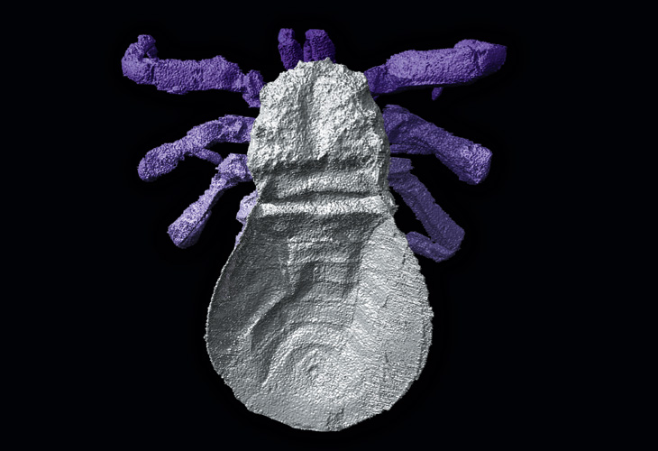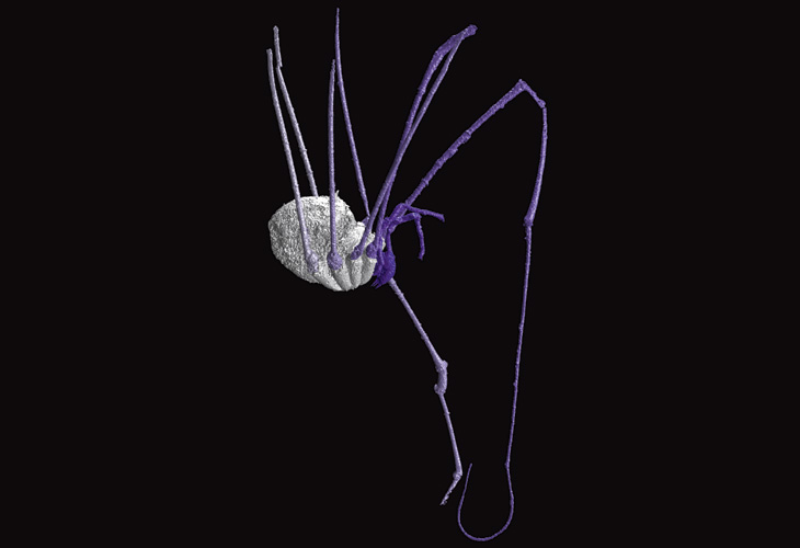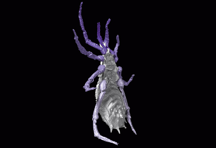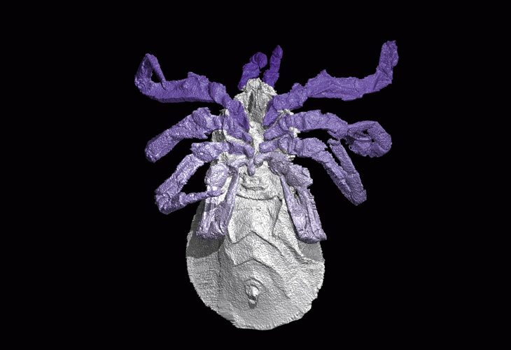 Garwood chose a 410-million-year-old fossil of a creature called a trigonotarbid, which despite being just a couple of millimeters long was one of the first predators to ever stalk on land. Garwood didn’t use X-rays to probe the fossil, because it is so similar to the rock encasing it that even synchrotron beams can’t tease it out. Instead, he used old-school techniques, studying thin sections of rock containing the fossil to develop 3-D maps. He transferred his maps of the animal’s leg fragments to computer-graphics software similar to that used to animate movie characters.