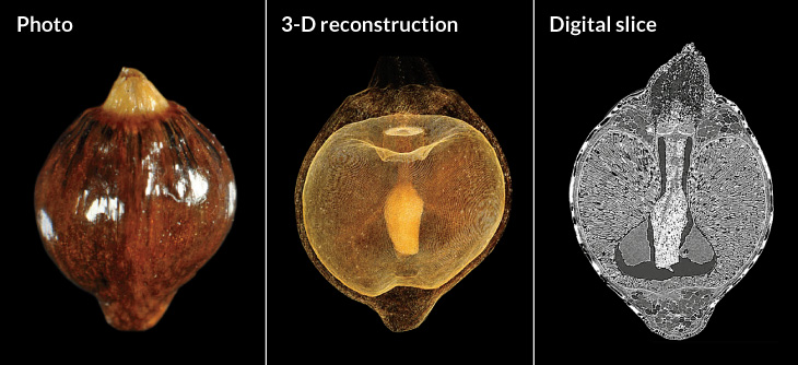Smith has been studying a part of the seed called an operculum, a little lid through which a germinating plant must push to escape the seed. The shape of the operculum varies dramatically among the banana and ginger plants, helping Smith place the seeds in their proper places on the evolutionary tree. Surprisingly, she says, botanists know relatively little about modern banana and ginger seeds, so she is scanning many of them as well.