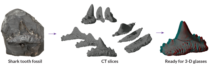CT scanning can take a single fossil (at left, a shark tooth embedded in rock) and, using X-rays to differentiate between the fossil and the encasing rock, extract virtual cross-sectional slices (center) of the remains. Adding lights, color and perspective renders the fossil into a three-dimensional view (right).