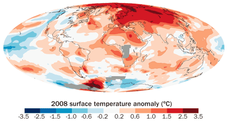 More than half a century ago, temperature records from Antarctica and the Arctic showed data “consistent with the theory that the entire world is slowly getting warmer,” Science News Letter reported. This low-grade fever began around 1900 and was believed “to amount to some two or three degrees each century” (2/28/59, p. 131). But not until the 1990s would climate experts from around the world begin issuing consensus statements through the Intergovernmental Panel on Climate Change warning of catastrophic climate perturbations if humankind didn’t put the brakes on releases of carbon dioxide and other greenhouse gases (6/23/90, p. 391) — preferably immediately (11/4/95, p. 293). As international agreements such as the 1997 Kyoto Protocol have largely failed in that task, scientists have expanded efforts to chronicle the world’s shifting climate (above, 2008 temperatures compared with 1950–1980 baseline period) and ecosystems (SN Online: 12/2/11). — Janet RaloffNote: N indicates findings that went on to win a Nobel Prize.