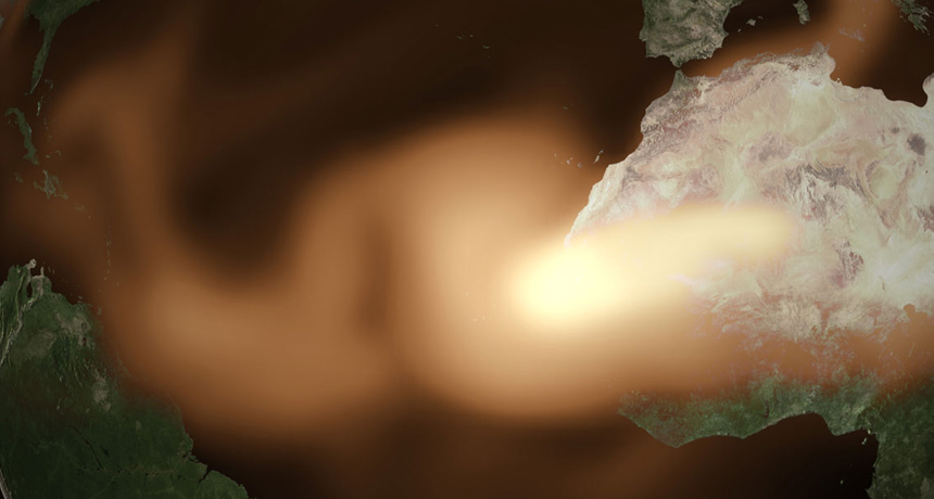 BLOWING IN THE WIND About 4,600 years ago, African dust wafted across the Atlantic (simulation shown) and into the Florida Everglades where it fertilized aquatic plants, researchers say.