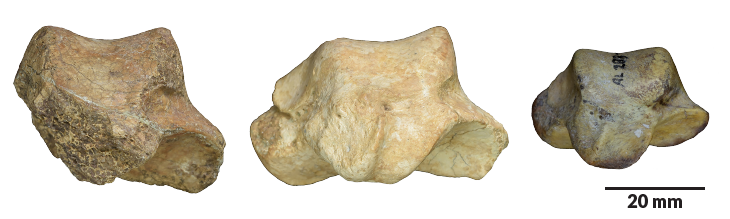 Corresponding ankle bones come from a more than 4-million-year-old Ardipithecus ramidus individual at Ethiopia’s Gona site (left), a member of the same species dubbed Ardi from a nearby site (middle), and from Lucy, a 3.2-million-year-old representative of Australopithecus afarensis (right). Both the Gona individual and Lucy possessed humanlike ankles.