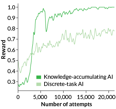 With further training, Xiong and colleagues’ system could master more skills. But this design is limited by the fact that the AI can only learn tasks assigned by the human programmer during training. Humans don’t have this kind of educational cutoff. When people finish school, “it’s not like, ‘Now you’re done learning. You can freeze your brain and go,’ ” Risi says.