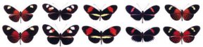 Each pair flashes a distinctive pattern of colored bands across dark wings. Read the caption closely. Partners in the pairs may look alike, but they don’t belong to the same species. Instead, the five butterflies with blatantly mismatched colors in the top row do belong to the same species. The bottom five, equally mismatched ones belong to a single other species.