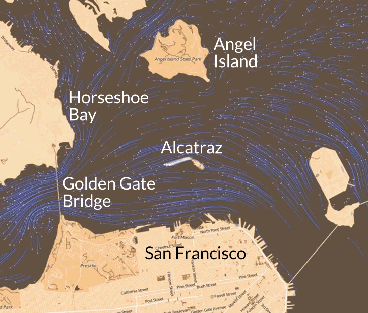 Simulations of San Francisco Bay reveal survivable scenarios for prison break