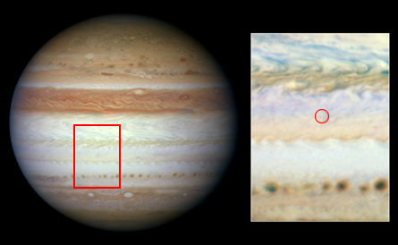 When fragments of Comet Shoemaker-Levy 9 struck Jupiter in 1994, and after an object, likely an asteroid, collided with the giant planet last year, plumes of dark, sooty material dredged up from beneath the planet’s outer cloud layer rained back down to create (SN Online: 6/2/10), smudges that could be seen in ultraviolet and visible-light photographs.