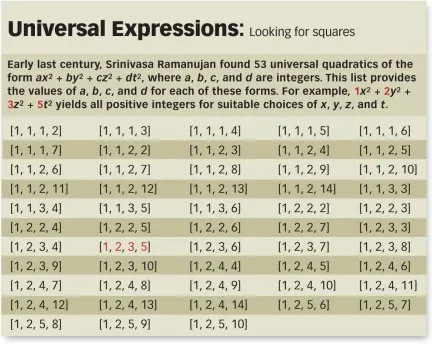 Early last century, Ramanujan focused on quadratic expressions of the form ax2 + by2 + cz2 + dt2, where a, b, c, and d are integers. He found the 53 universal quadratics in that group. For example, varying the values of x, y, z, and t in the quadratic form x2 + 2y2 + 5z2 + 10t2 can generate all positive integers. To get 14, set x = 1, y = 2, z = 1, t = 0; to get 32, set x = 0, y = 1, z = 2, and t = 1.