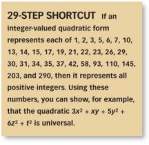 First, they found that a check of whether each of a certain set of 29 integers, each less than or equal to 290, reveals whether all integers can be represented by a given quadratic form. Bhargava and Hanke then used that finding to enumerate the complete list of universal, four-variable, integer-valued quadratic forms, which they determined includes 6,436 quadratics.