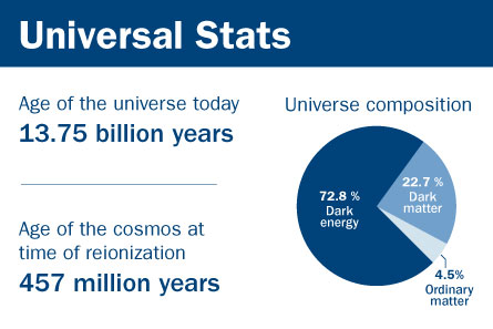To calculate the age of the universe, scientists including David Spergel of Princeton University and Charles Bennett of Johns Hopkins University in Baltimore compared the size of those hot and cold spots today with the size of the spots when the radiation was first released into space. Using data from WMAP along with studies of distant supernovas and other phenomena, the team finds that the universe is 13.75 billion years old, give or take 0.11 billion. (By comparison, the team’s previous calculation, which used the same method but included only five years of satellite observations, had pegged the universe at 13.73 billion years, plus or minus 0.12 billion.)