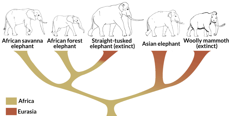 This tree shows a revision to how scientists think straight-tusked elephants fit into elephant evolution: Straight-tusked elephants shared the most common ancestors with African forest elephants, rather than Asian elephants.