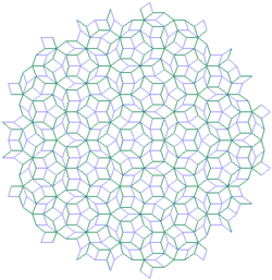 Penrose tilings also have fivefold rotational symmetry, the same kind of a symmetry that a five-pointed star has. If you rotate the whole pattern by 72 degrees, it looks just the same.