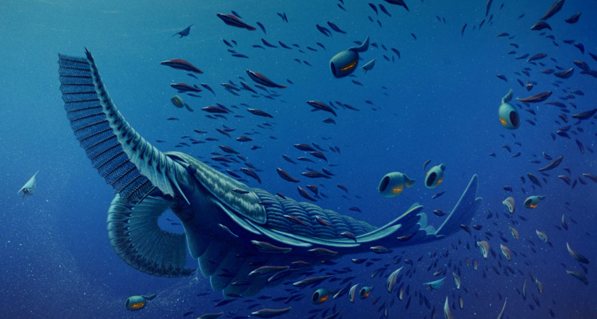 GENTLE GIANT Tamisiocaris borealis, an up to 70-centimeter-long filter feeder from the Cambrian period, swims among other ancient species in an artist’s reconstruction. The giant predator probably used its spiny appendages (left) to sweep food into its mouth, scientists say.