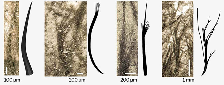 Sketches of four types of fibers, set next to their placement within a pterosaur fossil, reveal how branches appear at different places along the central filament. The first pair is a single smooth fiber that may have been fur. The second has a brushlike structure and may have consisted of fused bundles of small filaments. The third has a central filament similar to the first fiber, but with short branches near the midpoint. The fourth fiber type consists of tufts of curved, branching filaments.