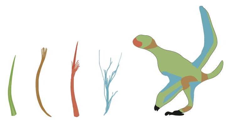 Scientists identified four distinct types of fibers preserved with a pterosaur fossil. One type (green) was a single, smooth fiber that covered much of the animal’s body, and may have resembled fur. The other fibers (brown, red and blue) appear more featherlike, with branching structures springing from different parts of a central fiber. Those fibers were found only on certain parts of the specimen’s body, such as the head, wings or tail.