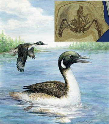 Fragmentary fossils of Gansus yumenensis collected earlier had suggested that it was a wading bird similar to today’s sandpipers, says Jerald D. Harris, a paleontologist at Dixie State College in St. George, Utah. The new specimens (one shown in inset) from northwestern China, which together include all the bird’s bones except its skull and upper neck, informed this artist’s sketch. The bird’s shape and its webbed feet indicate that the creature was a foot-propelled diver like modern loons. Features of some bones establish G. yumenensis as the oldest known ancestor of modern birds, Harris and his colleagues assert in the June 16 Science.