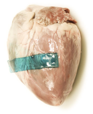 STICK TEST Researchers put an adhesive inspired by the chemical structure of slug slime through its paces. The glue stayed firmly attached even when stretched, for example, and was able to cling to the slippery surface of a bloody pig heart. J. Li et al/Science 2017 |