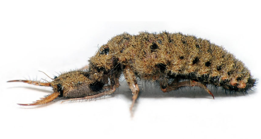 Instead of mouths, the larvae rely on two long, toothed hooks at the front of the head. The youngsters dig pits in sand and bury themselves up to the hooks, ready to grab and stab ants or other insects that tumble in.