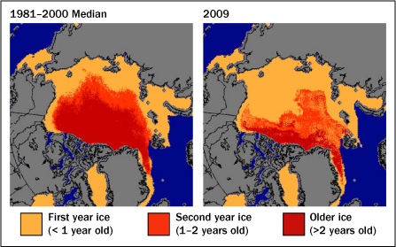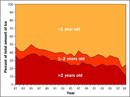 Thinner ice is more likely to melt over the course of a summer, says Ron Kwok, an analyst at NASA’s Jet Propulsion Laboratory in Pasadena, Calif. While multiyear ice is often three meters or more thick, first-year ice measures only two meters thick or less. In recent years, wind patterns have driven large amounts of multiyear ice from the Arctic Ocean into the North Atlantic, and winter refreezing hasn’t caught up with that ice loss, he commented at the press conference.