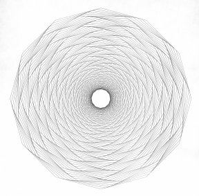 John Sharp of Watford, Herts, England, became interested in the artistic possibilities of pursuit curves in the late 1960s. He had studied chemistry at Oxford University and worked in industry as an analytical chemist for part of his career. He later wrote computer manuals. In school, Sharp also showed a talent for art. The fact that he is red-green color blind prompted an interest in optics and the psychology of vision.