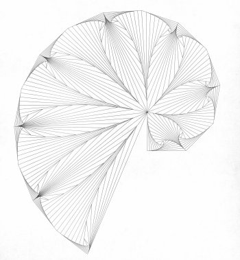 The final image is made entirely of the straight lines drawn between hound and hare. “The wildly meandering curve, which is the path of the hound, is an emergent property of the algorithm, rising into visibility because the drawn straight lines are all tangent to this curve,” Brill notes.
