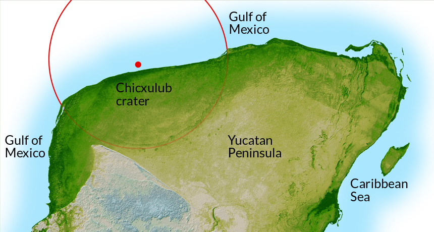 BIG IMPACT New evidence of global cooling after the asteroid impact 66 million years ago in what’s now Chicxulub, Mexico, supports the idea that photosynthesis stopped. The lack of food coupled with acid rain and greenhouse gases drove most organisms to extinction.