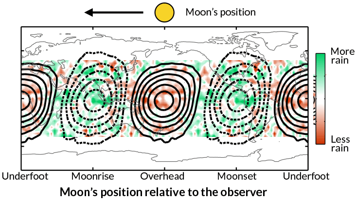 The cause is the atmospheric equivalent of ocean tides, researchers propose in a paper to be published in Geophysical Research Letters. Air gathers on Earth’s moon-facing side and on the opposite end of the globe. Scientists noticed that this pileup increases atmospheric pressure and predicted that atmospheric tides could alter precipitation rates as well. Scouring 15 years of global precipitation data, the researchers have discovered that the effect is present, but tiny: an approximately one micrometer per hour change in rainfall rate.