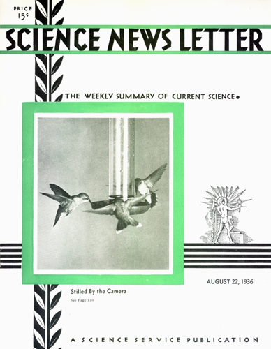 A remarkable stop-motion photograph of three female ruby-throated hummingbirds hovering about a vial of sweetened liquid is shown on the cover of this week’s Science News Letter.