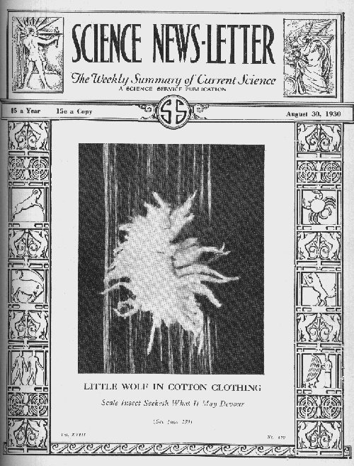 Wolves in the clothing of sheep have been familiar, at least as metaphors, for a couple of millennia. More lately, since we have begun to pay close attention to our trees and shrubs, have we become acquainted with a tiny wolf disguised as a tiny tuft of cotton. The cottony cushion scale is one of the most bothersome of the parasitic insects that suck the lifesap of plants. The magnifying eye of Cornelia Clarke’s camera has picked up one of these little monsters, and gives us a better idea of the details of his camouflage, as shown on the cover picture of this issue of the Science News-Letter.