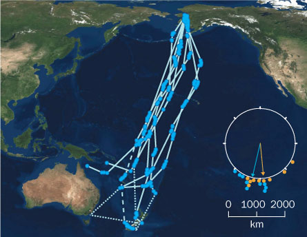 A team of researchers headed by Robert Gill Jr. of the U.S. Geological Survey Alaska Science Center in Anchorage implanted tiny satellite trackers in female godwits near the Alaska coast. Males, which are typically smaller, were harnessed with external (and lighter) satellite trackers on their legs. Scientists then monitored the changing coordinates of the godwits as the birds made their long flight over the Pacific Ocean.