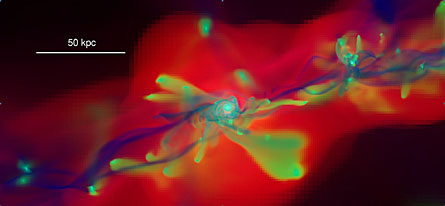 This movie models how a galaxy acquires most of its gas — the raw material for making stars. Red is hot gas, blue shows the cold streams of gas that flow like a river toward the galaxy’s center, and green shows gas that has been stripped out of satellite galaxies and enriched in metal content by supernova explosions. Credit: B. Moore, Oscar Agertz and Romain Teyssier/University of Zurich