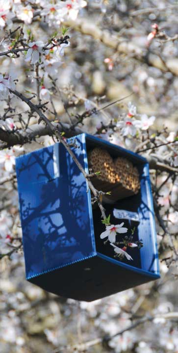 Wardell will not be rearing honeybees, the mainstay of farmers for centuries. Instead, he hopes to create a workforce of tens of thousands of blue orchard bees, species Osmia lignaria. These small, dark, mild-mannered creatures with a vest of white fuzz have no interest in making honey or joining in colonies the way honeybees do. But blue orchard bees do visit almond trees, and as a female collects pollen for her eggs, she inadvertently transfers some of it from flower to flower. Wardell hopes the blue orchard bees will serve as a backup, or maybe a partner, to the increasingly expensive and beleaguered honeybee pollinator. The blue orchard bees, he says, could be the farm’s “insurance.”