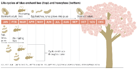 In days when honeybees face increasing threats from diseases and pesticide-intensive farming, interest is growing in such “insurance” pollinators. The blue orchard bees are just one example of an alternative to honeybee pollination on the buzzing edge of research.
