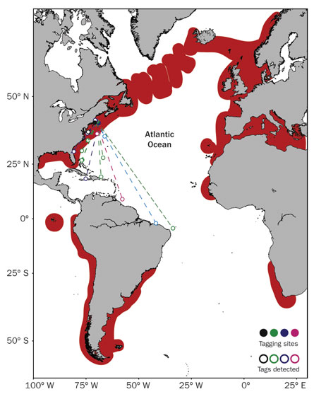 Each shark was tagged with a unit that recorded water temperature, ambient light and pressure. The tags were programmed to fall off the shark at points throughout the winter and pop up to the surface of the ocean to transmit the data via satellite.