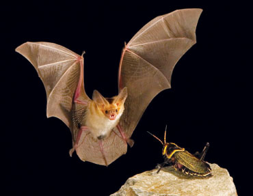 Bats are also interesting to scientists because bat brains must switch between several kinds of input to make sense of the world. Like people, they use their ears and eyes (contrary to popular myth, no bat species is entirely blind, though some rely on vision more than others). On top of that, most bats also use echolocation to sense their surroundings. While flying, an echolocating bat produces calls that bounce off objects — such as trees to avoid or insects to chase — then return to the bat as echoes. With their supersensitive ears, and their finely tuned brains, bats use this information to determine where things are. The echolocation calls are typically beyond the range of human hearing, which is good because the calls are quite loud, about 100 decibels or so, says Khaleel A. Razak, a neuroscientist at the University of California, Riverside. He likens the volume to what a person would experience standing next to a pounding jackhammer.